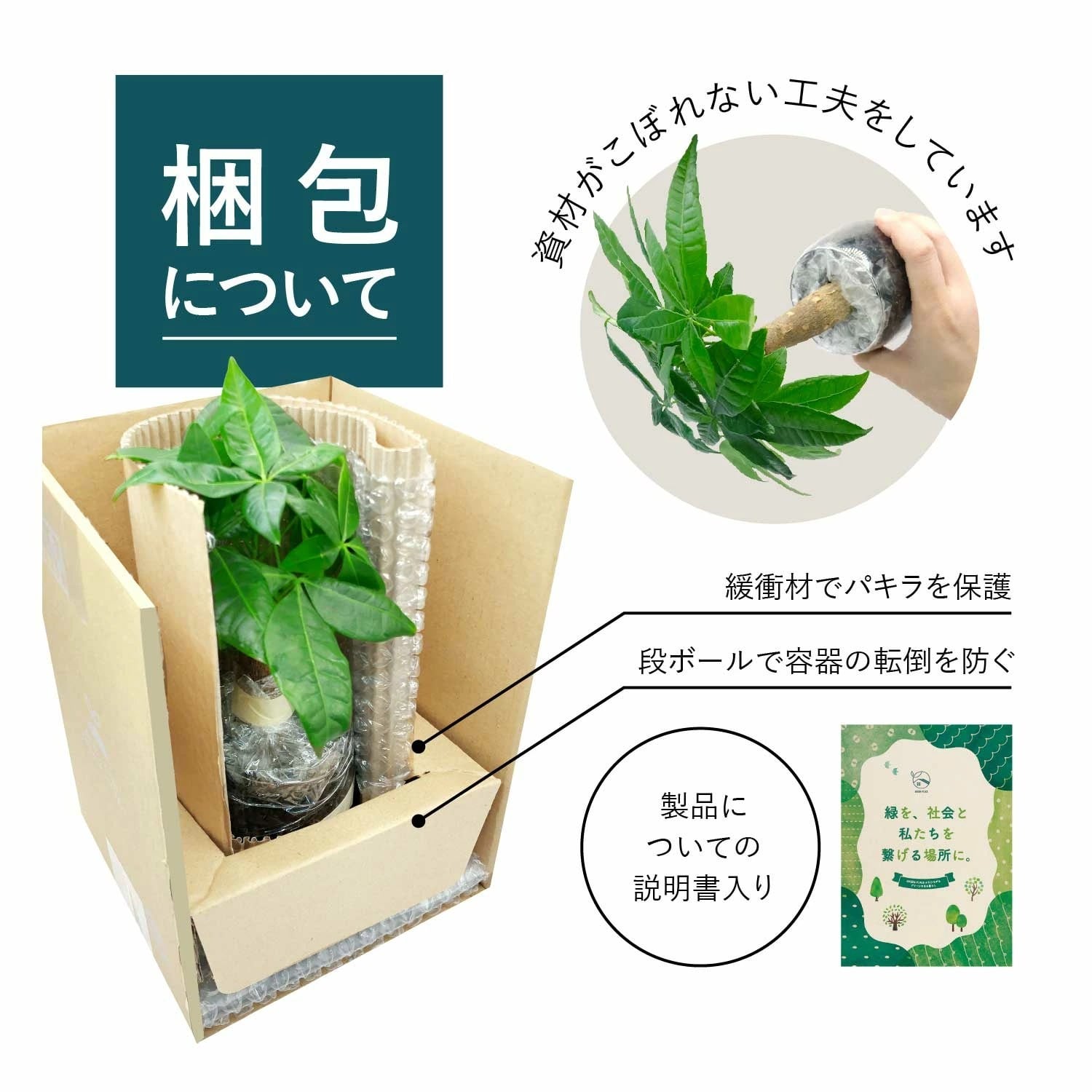 虫がわきにくいミニ観葉植物として人気の、編み込まれた幹と手のひら型の5枚葉が特徴的な植物です。「発財樹」とも呼ばれ、金運アップの象徴として親しまれています。コンパクトなサイズながら存在感があり、デスクや棚の上、洗面所などちょっとしたスペースにも気軽に置けます。美しい編み込み幹と鮮やかな緑の葉が、空間にスタイリッシュな印象をもたらしてくれます。乾燥に強く丈夫で育てやすいため、観葉植物初心者の方にもおすすめです。