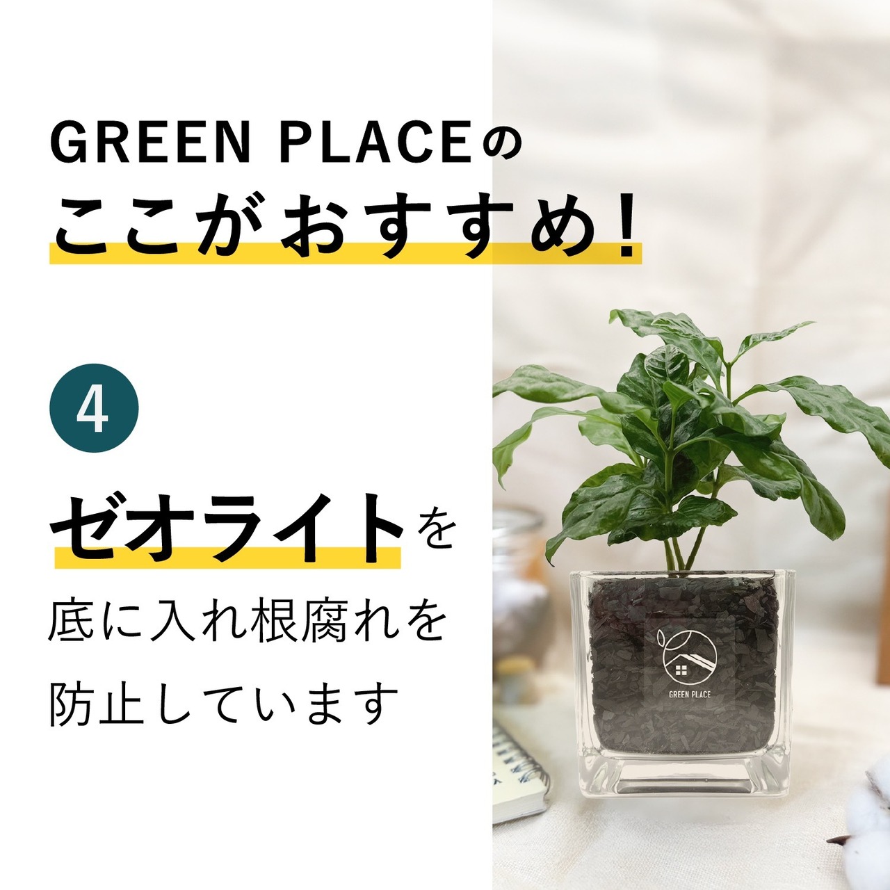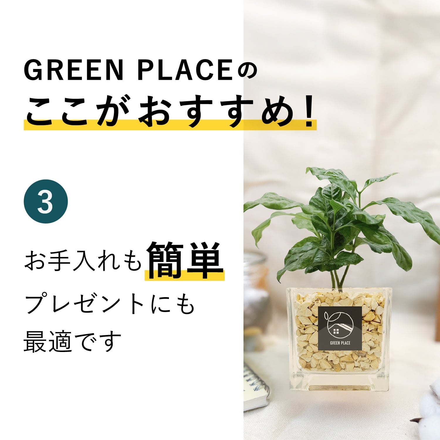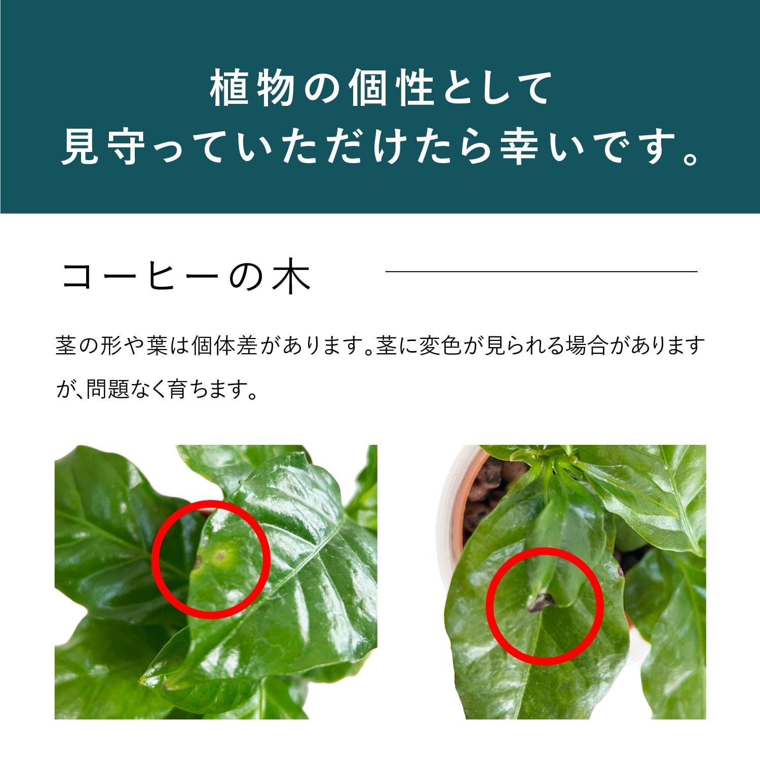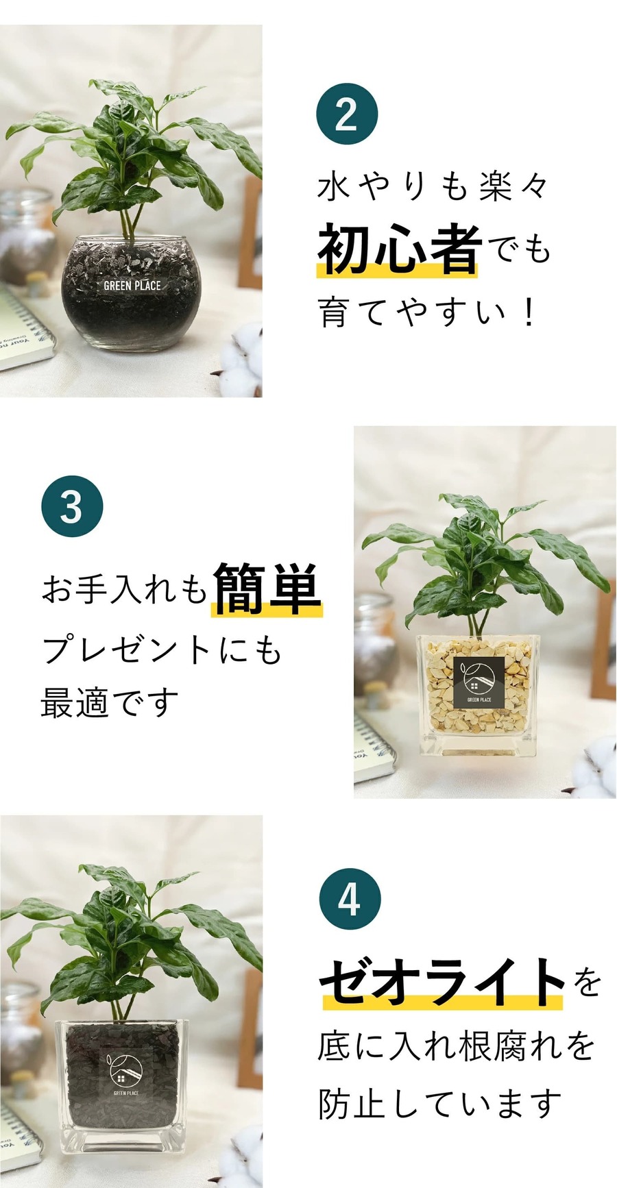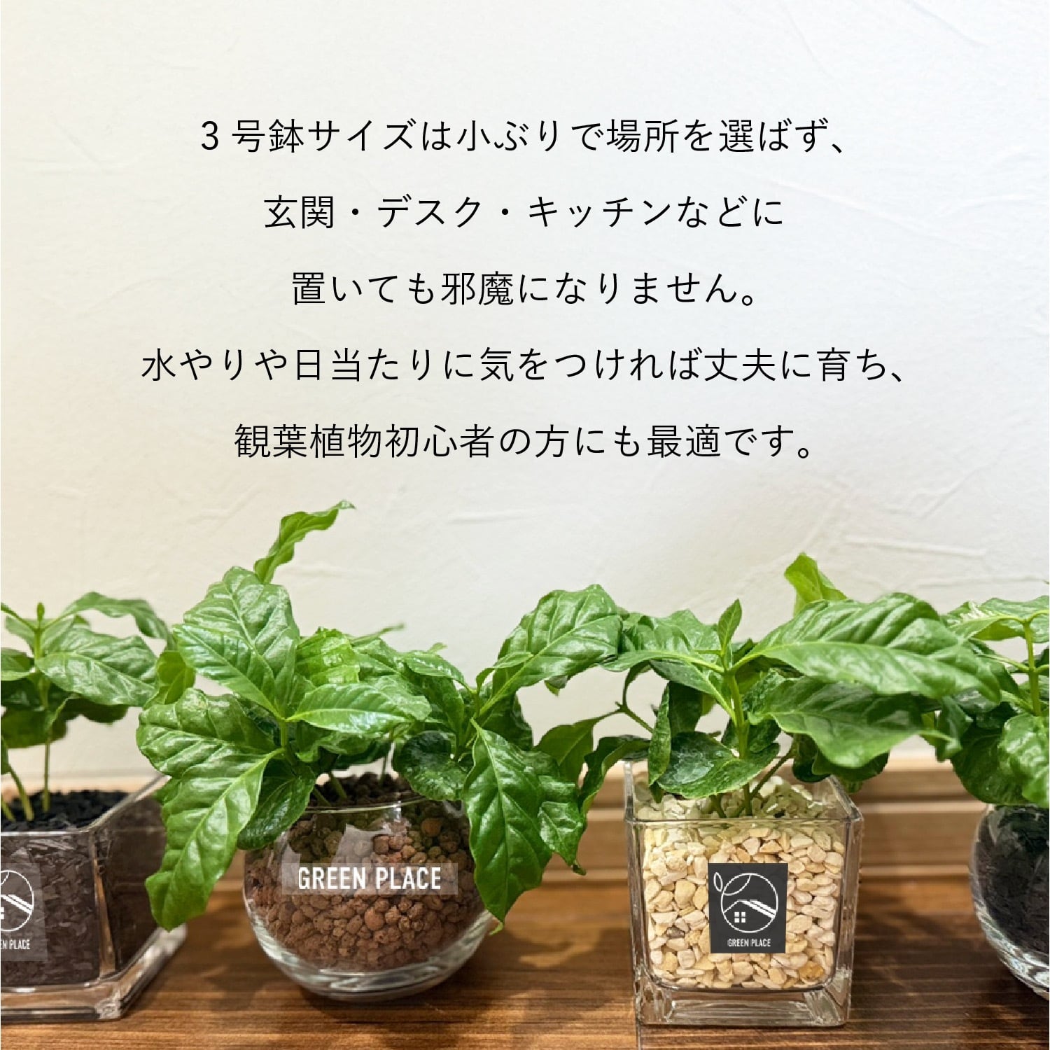 虫がわきにくいミニ観葉植物として人気の、光沢のある美しい濃緑の葉が特徴的な常緑樹です。コンパクトなサイズながら存在感があり、デスクや棚の上、洗面所などちょっとしたスペースにも気軽に置けます。楕円形の美しい葉と、うまく育てれば数年後に小さな白い花や赤い実(コーヒーチェリー)を楽しめる可能性があり、空間にトロピカルな雰囲気をもたらしてくれます。丈夫で育てやすく、コーヒー好きの方への贈り物にもおすすめです。